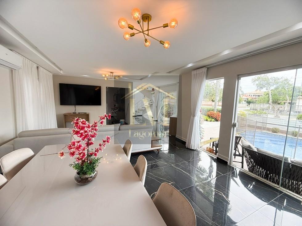Na área externa, o imóvel dispõe de piscina, churrasqueira e sistema de energia solar, proporcionando lazer e economia no dia a dia. Os ambientes contam com móveis planejados e ar-condicionado, reforçando o padrão de conforto da casa.