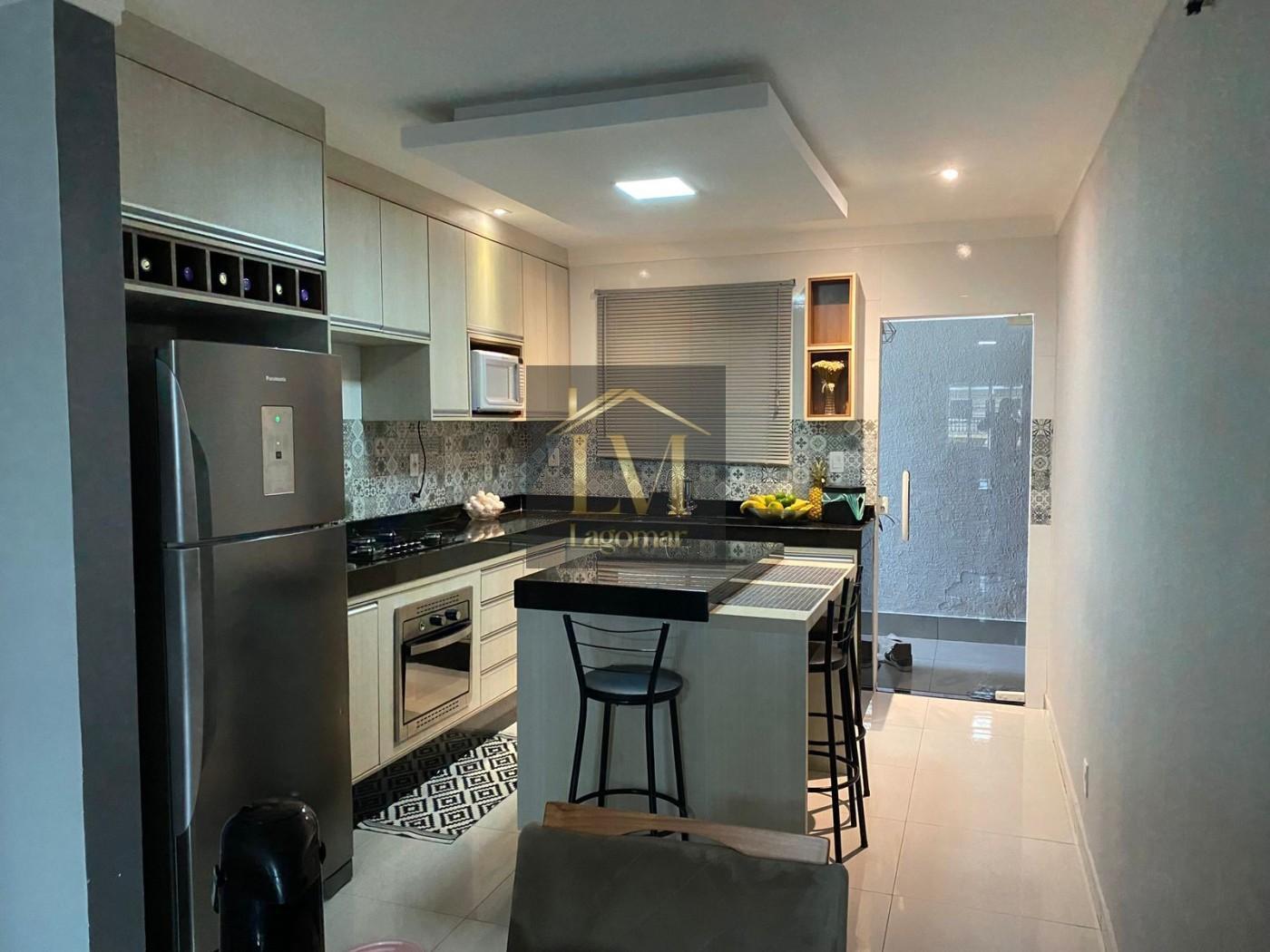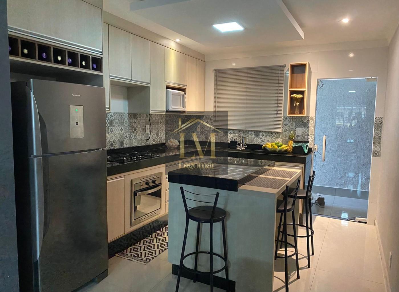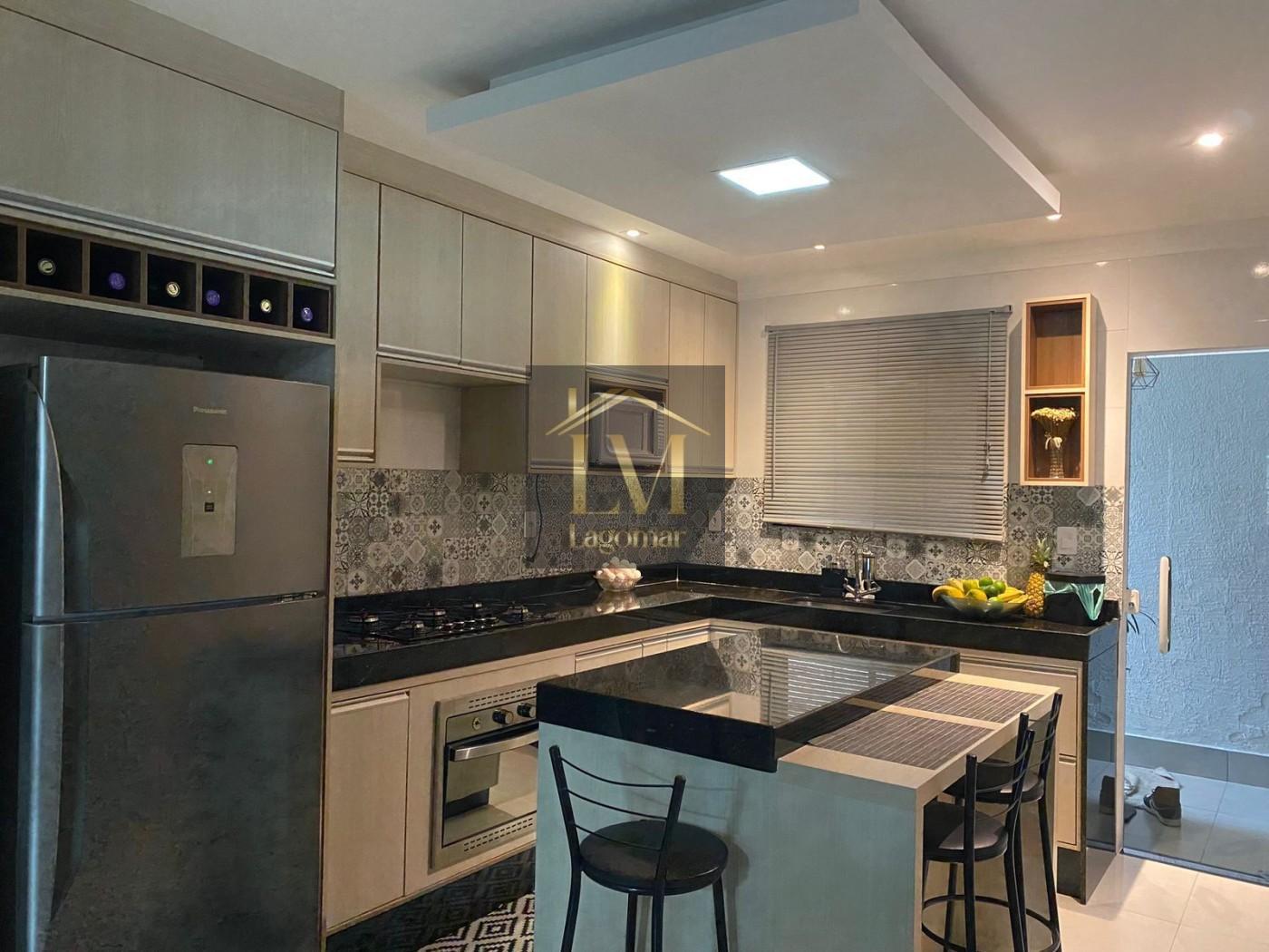 A cozinha americana com ilha e móveis planejados integra charme e funcionalidade, perfeita para receber. A iluminação, com pontos diretos e indiretos, cria uma atmosfera sofisticada, complementada pelo elegante rebaixamento em gesso.